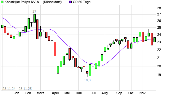 Mit dem Rücksetzer auf 23,80 EUR hat die Philips Electronics ADR-Aktie am 27.11.2025 die 50-Tage-Linie nach unten gekreuzt.