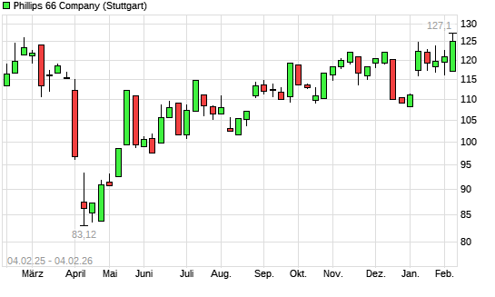 Mit dem Anstieg auf 125,02 EUR hat die Phillips 66-Aktie (ISIN US7185461040) am 03.02.2026 ein neues 6-Monats-Hoch erreicht und damit den Kurs vom 08.01.2026 eingestellt.