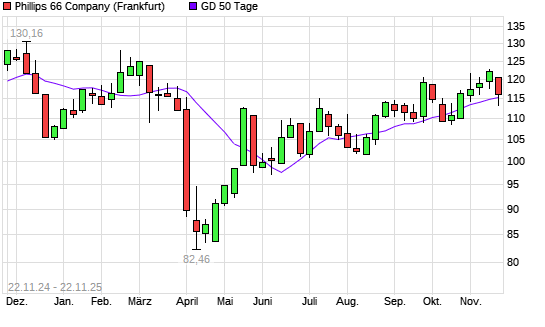 Mit dem Anstieg auf 116,14 EUR hat die Phillips 66-Aktie am 21.11.2025 die 50-Tage-Linie nach oben gekreuzt.