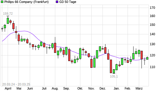 Mit dem Rücksetzer auf 117,82 EUR hat die Phillips 66-Aktie am 19.03.2025 die 50-Tage-Linie nach unten gekreuzt.