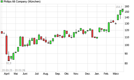 Mit dem Anstieg auf 153,22 EUR hat die Phillips 66-Aktie (ISIN US7185461040) am 19.03.2026 ein neues 12-Monats-Hoch erreicht und damit den Kurs vom 13.03.2026 eingestellt.Die ...weiterlesen