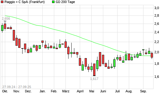 Mit dem Rücksetzer auf 1,91 EUR hat die Piaggio-Aktie am 26.09.2025 die 200-Tage-Linie nach unten gekreuzt.