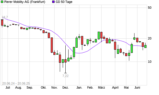 Mit dem Rücksetzer auf 15,62 EUR hat die Pierer Mobility-Aktie am 19.06.2025 die 50-Tage-Linie nach unten gekreuzt.