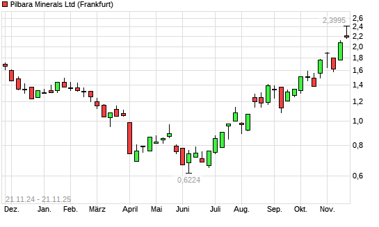 Mit dem Anstieg auf 2,27 EUR hat die Pilbara Minerals-Aktie (ISIN AU000000PLS0) am 20.11.2025 ein neues 12-Monats-Hoch erreicht und damit den Kurs vom 17.11.2025 eingestellt.