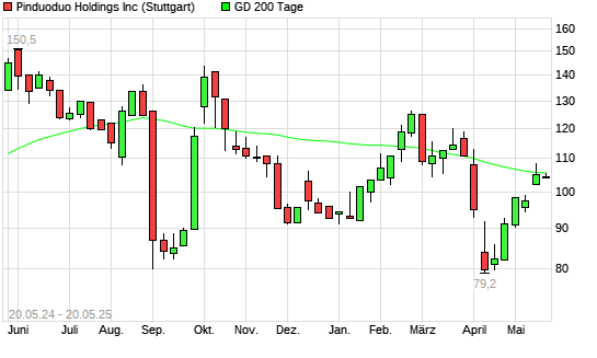 Mit dem Rücksetzer auf 102,00 EUR hat die Pinduoduo-Aktie am 19.05.2025 die 200-Tage-Linie nach unten gekreuzt.