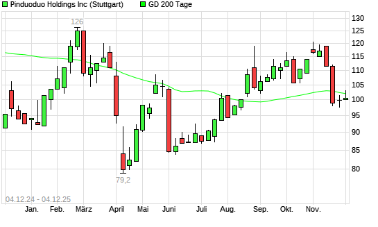 Mit dem Rücksetzer auf 99,80 EUR hat die Pinduoduo-Aktie am 03.12.2025 die 200-Tage-Linie nach unten gekreuzt.