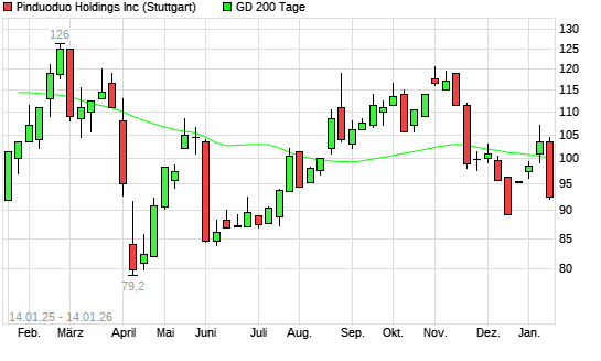 Mit dem Rücksetzer auf 95,80 EUR hat die Pinduoduo-Aktie am 13.01.2026 die 200-Tage-Linie nach unten gekreuzt.