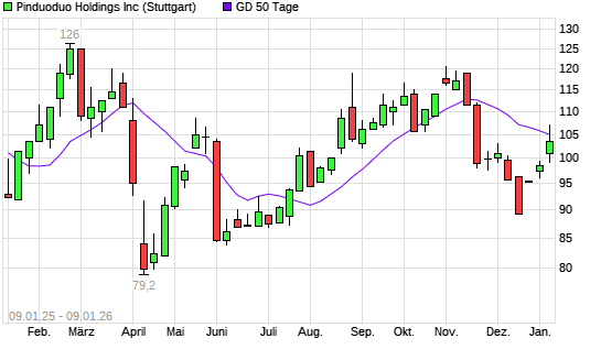 Mit dem Rücksetzer auf 99,80 EUR hat die Pinduoduo-Aktie am 08.01.2026 die 50-Tage-Linie nach unten gekreuzt.