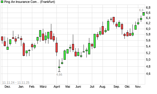Mit dem Anstieg auf 6,50 EUR hat die Ping An Insurance China-Aktie (ISIN CNE1000003X6) am 10.11.2025 ein neues 12-Monats-Hoch erreicht und damit den Kurs vom 06.11.2025 eingestellt.