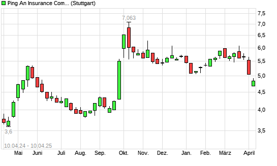 Mit dem Rücksetzer auf 4,70 EUR hat die Ping An Insurance China-Aktie (ISIN CNE1000003X6) am 09.04.2025 ein neues 6-Monats-Tief erreicht und damit den Kurs vom 08.04.2025 eingestellt.