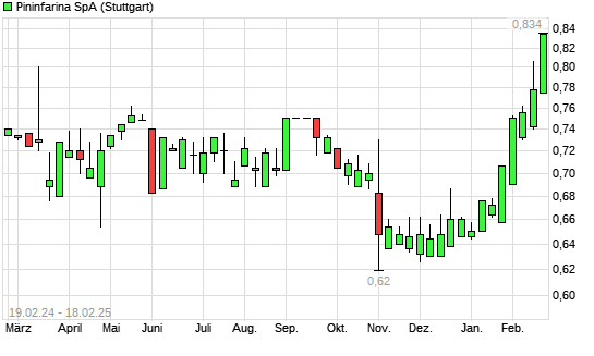 Mit dem Anstieg auf 0,80 EUR hat die Pininfarina-Aktie (ISIN IT0003056386) am 17.02.2025 ein neues 6-Monats-Hoch erreicht und damit den Kurs vom 13.02.2025 eingestellt.