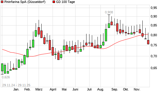 Mit dem Anstieg auf 0,85 EUR hat die Pininfarina-Aktie am 28.11.2025 die 100-Tage-Linie nach oben gekreuzt.