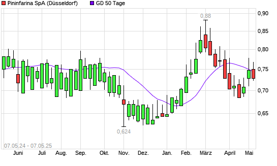Mit dem Rücksetzer auf 0,73 EUR hat die Pininfarina-Aktie am 06.05.2025 die 50-Tage-Linie nach unten gekreuzt.