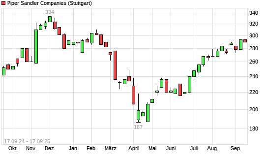 Mit dem Anstieg auf 290,00 EUR hat die Piper Jaffray-Aktie (ISIN US7240781002) am 16.09.2025 ein neues 6-Monats-Hoch erreicht und damit den Kurs vom 15.09.2025 eingestellt.