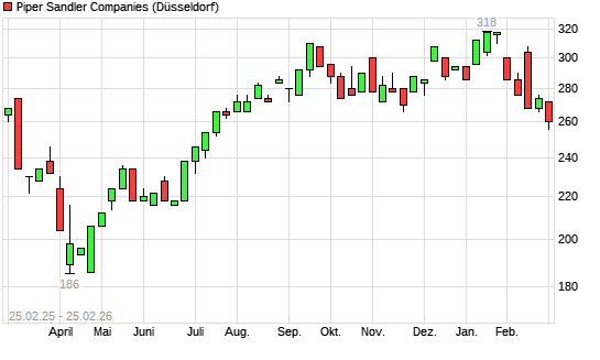 Mit dem Rücksetzer auf 260,00 EUR hat die Piper Sandler-Aktie (ISIN US7240781002) am 24.02.2026 ein neues 6-Monats-Tief erreicht und damit den Kurs vom 23.02.2026 eingestellt.
