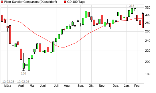 Mit dem Rücksetzer auf 286,00 EUR hat die Piper Sandler-Aktie am 12.02.2026 die 100-Tage-Linie nach unten gekreuzt.
