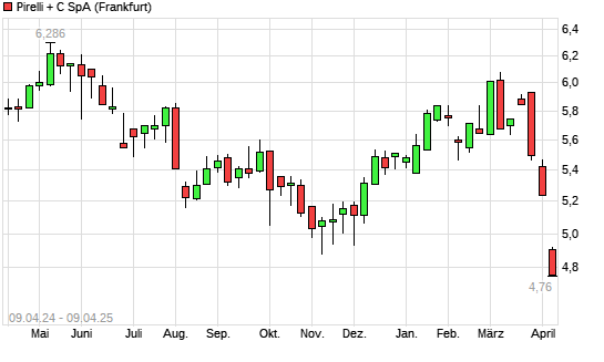 Mit dem Rücksetzer auf 4,85 EUR hat die Pirelli-Aktie (ISIN IT0005278236) am 08.04.2025 ein neues 12-Monats-Tief erreicht und damit den Kurs vom 06.11.2024 eingestellt.