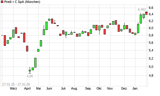 Mit dem Anstieg auf 6,45 EUR hat die Pirelli-Aktie (ISIN IT0005278236) am 26.01.2026 ein neues 3-Jahres-Hoch erreicht und damit den Kurs vom 15.01.2026 eingestellt.