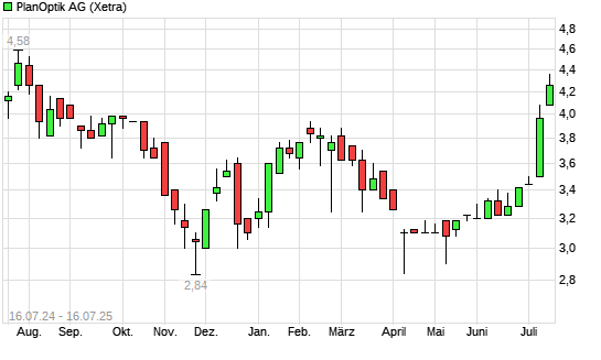 Mit dem Anstieg auf 4,26 EUR hat die Plan Optik-Aktie (ISIN DE000A0HGQS8) am 15.07.2025 ein neues 6-Monats-Hoch erreicht und damit den Kurs vom 14.07.2025 eingestellt.
