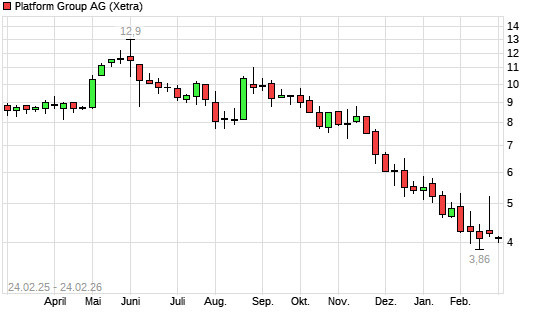 Mit dem Rücksetzer auf 3,98 EUR hat die Platform Group-Aktie (ISIN DE000A40ZW88) am 23.02.2026 ein neues 3-Jahres-Tief erreicht und damit den Kurs vom 02.02.2026 eingestellt.