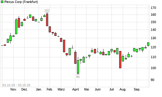 Mit dem Anstieg auf 125,00 EUR hat die Plexus-Aktie (ISIN US7291321005) am 02.10.2025 ein neues 6-Monats-Hoch erreicht und damit den Kurs vom 24.09.2025 eingestellt.