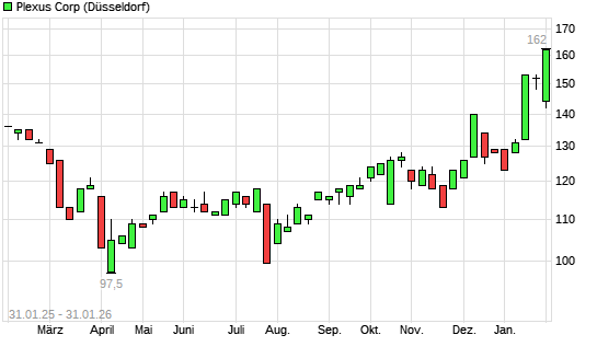 Mit dem Anstieg auf 163,00 EUR hat die Plexus-Aktie (ISIN US7291321005) am 30.01.2026 ein neues All-Time-High erreicht und damit den Kurs vom 22.01.2025 eingestellt.