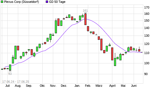 Mit dem Rücksetzer auf 112,00 EUR hat die Plexus-Aktie am 16.06.2025 die 50-Tage-Linie nach unten gekreuzt.