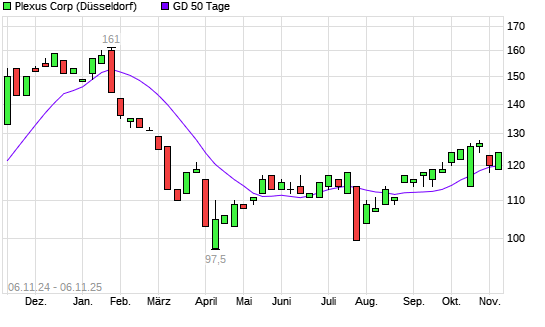 Mit dem Rücksetzer auf 120,00 EUR hat die Plexus-Aktie am 05.11.2025 die 50-Tage-Linie nach unten gekreuzt.