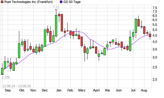 Mit dem Rücksetzer auf 4,30 EUR hat die Poet Technologies-Aktie am 12.08.2025 die 50-Tage-Linie nach unten gekreuzt.