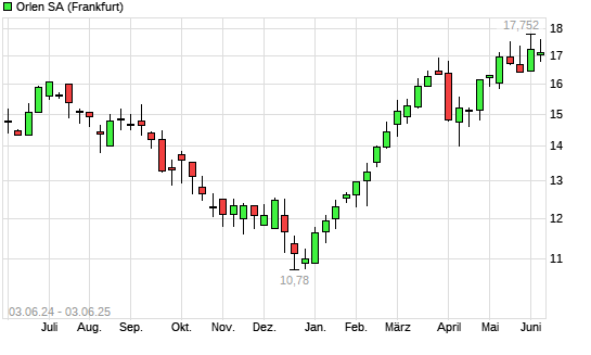Mit dem Anstieg auf 17,58 EUR hat die Polski Koncern Naftowy Orlen-Aktie (ISIN PLPKN0000018) am 02.06.2025 ein neues 3-Jahres-Hoch erreicht und damit den Kurs vom 28.05.2025 eingestellt.