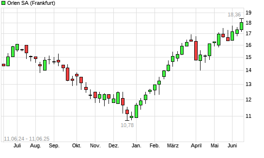 Mit dem Anstieg auf 18,36 EUR hat die Polski Koncern Naftowy Orlen-Aktie (ISIN PLPKN0000018) am 10.06.2025 ein neues 3-Jahres-Hoch erreicht und damit den Kurs vom 04.06.2025 eingestellt.