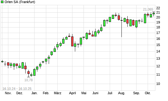 Mit dem Anstieg auf 21,00 EUR hat die Polski Koncern Naftowy Orlen-Aktie (ISIN PLPKN0000018) am 15.10.2025 ein neues 5-Jahres-Hoch erreicht und damit den Kurs vom 14.07.2025 eingestellt.