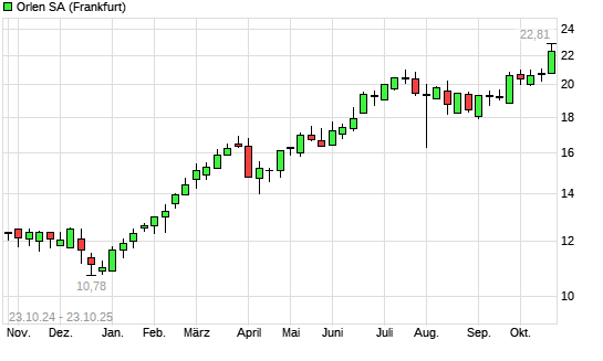 Mit dem Anstieg auf 22,81 EUR hat die Polski Koncern Naftowy Orlen-Aktie (ISIN PLPKN0000018) am 22.10.2025 ein neues 5-Jahres-Hoch erreicht und damit den Kurs vom 20.10.2025 eingestellt.