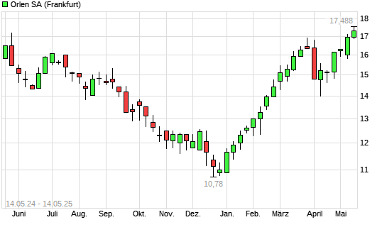 Mit dem Anstieg auf 17,05 EUR hat die Polski Koncern Naftowy Orlen-Aktie (ISIN PLPKN0000018) am 13.05.2025 ein neues 6-Monats-Hoch erreicht und damit den Kurs vom 09.05.2025 eingestellt.