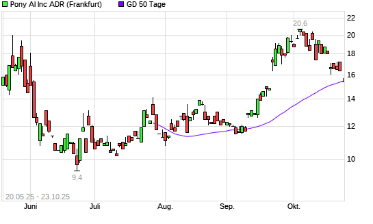 Mit dem Rücksetzer auf 15,10 EUR hat die Pony AI-Aktie am 22.10.2025 die 50-Tage-Linie nach unten gekreuzt.