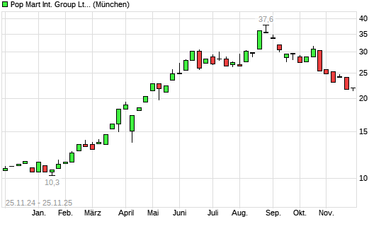 Mit dem Rücksetzer auf 21,40 EUR hat die Pop Mart International-Aktie (ISIN KYG7170M1033) am 24.11.2025 ein neues 6-Monats-Tief erreicht und damit den Kurs vom 21.11.2025 eingestellt.