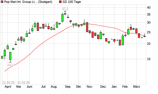 Mit dem Rücksetzer auf 23,20 EUR hat die Pop Mart International-Aktie am 20.03.2026 die 100-Tage-Linie nach unten gekreuzt.