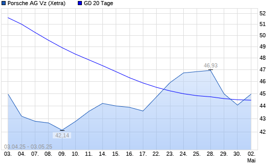 Mit dem Anstieg auf 44,85 EUR hat die Porsche AG Vz.-Aktie am 02.05.2025 die 20-Tage-Linie nach oben gekreuzt.