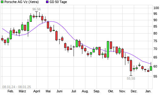 Mit dem Anstieg auf 61,00 EUR hat die Porsche AG Vz.-Aktie am 07.01.2025 die 50-Tage-Linie nach oben gekreuzt.