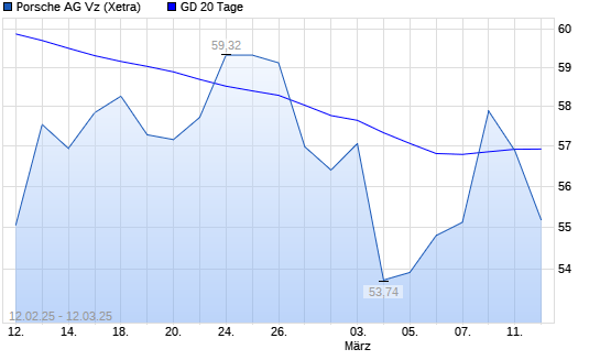 Mit dem Rücksetzer auf 56,46 EUR hat die Porsche AG Vz.-Aktie am 11.03.2025 die 20-Tage-Linie nach unten gekreuzt.