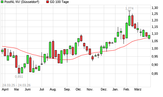 Mit dem Rücksetzer auf 1,07 EUR hat die PostNL-Aktie am 23.03.2026 die 100-Tage-Linie nach unten gekreuzt.