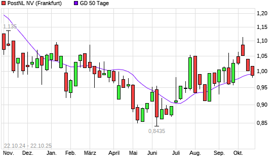 Mit dem Rücksetzer auf 0,99 EUR hat die PostNL-Aktie am 21.10.2025 die 50-Tage-Linie nach unten gekreuzt.