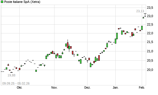 Mit dem Anstieg auf 23,03 EUR hat die Poste Italiane-Aktie (ISIN IT0003796171) am 04.02.2026 ein neues All-Time-High erreicht und damit den Kurs vom 03.02.2026 eingestellt.