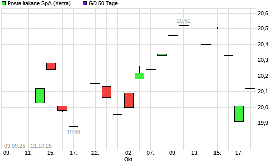 Mit dem Anstieg auf 20,19 EUR hat die Poste Italiane-Aktie am 20.10.2025 die 50-Tage-Linie nach oben gekreuzt.