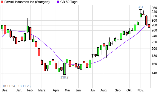 Mit dem Anstieg auf 283,60 EUR hat die Powell Industries-Aktie am 17.11.2025 die 50-Tage-Linie nach oben gekreuzt.