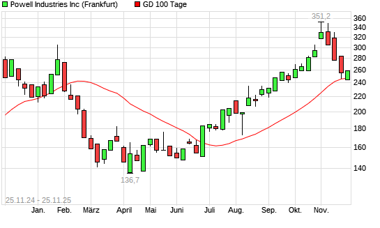 Mit dem Rücksetzer auf 244,60 EUR hat die Powell Industries-Aktie am 24.11.2025 die 100-Tage-Linie nach unten gekreuzt.