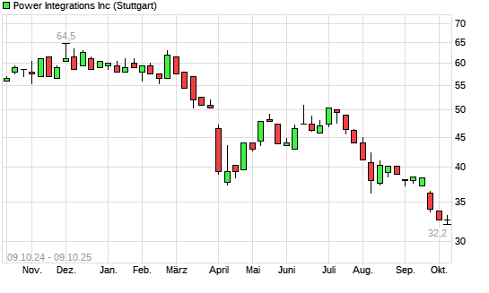 Mit dem Rücksetzer auf 32,20 EUR hat die Power Integrations-Aktie (ISIN US7392761034) am 08.10.2025 ein neues 5-Jahres-Tief erreicht und damit den Kurs vom 06.10.2025 eingestellt.