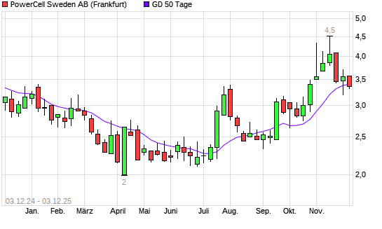 Mit dem Rücksetzer auf 3,31 EUR hat die PowerCell Sweden-Aktie am 02.12.2025 die 50-Tage-Linie nach unten gekreuzt.