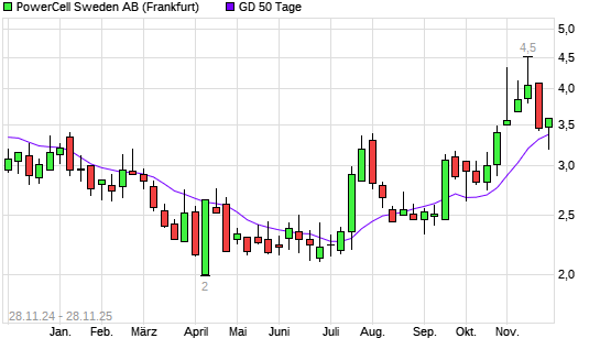 Mit dem Anstieg auf 3,46 EUR hat die PowerCell Sweden-Aktie am 27.11.2025 die 50-Tage-Linie nach oben gekreuzt.Die PowerCell Sweden-Aktie befindet sich seit dem 17.09.2025 im langfristigen Aufwärtstrend ...weiterlesen