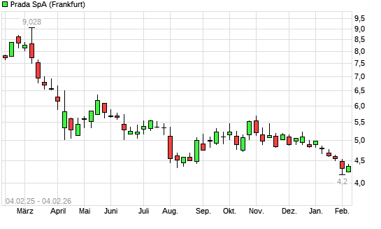 Mit dem Rücksetzer auf 4,27 EUR hat die Prada-Aktie (ISIN IT0003874101) am 03.02.2026 ein neues 5-Jahres-Tief erreicht und damit den Kurs vom 08.03.2022 eingestellt.